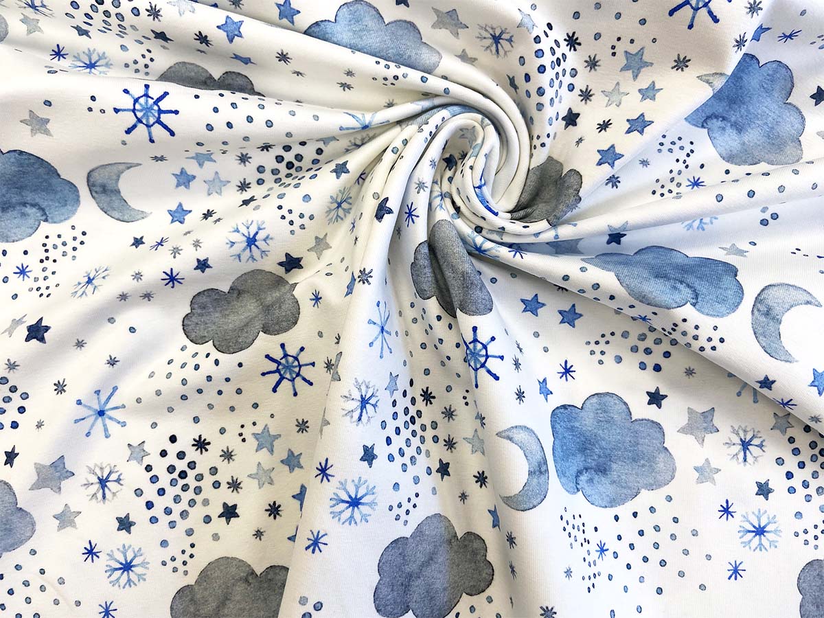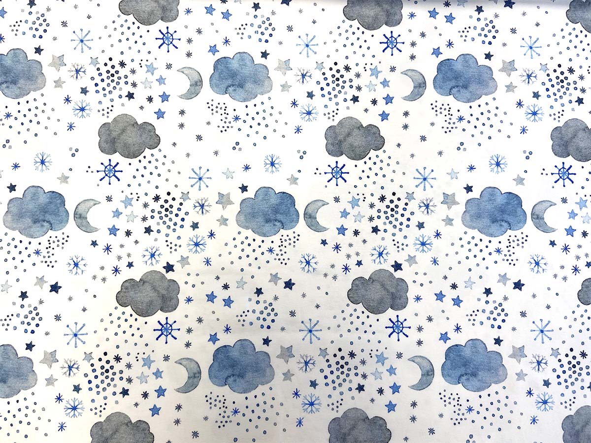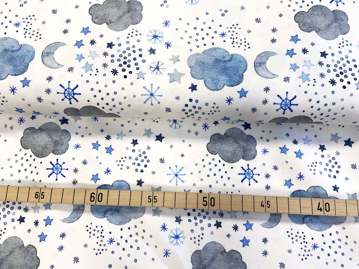 Baumwolljersey "Pingu Night" mit Wolken und Schneeflocken in blau auf weißem Hintergrund von Hilco.