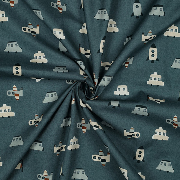Über den Wolken & auf der Straße: Baumwollpopeline „Fahrzeuge“ in Petrol – Dein Stoff für kleine Entdecker