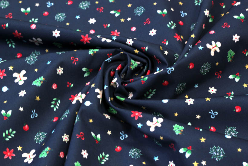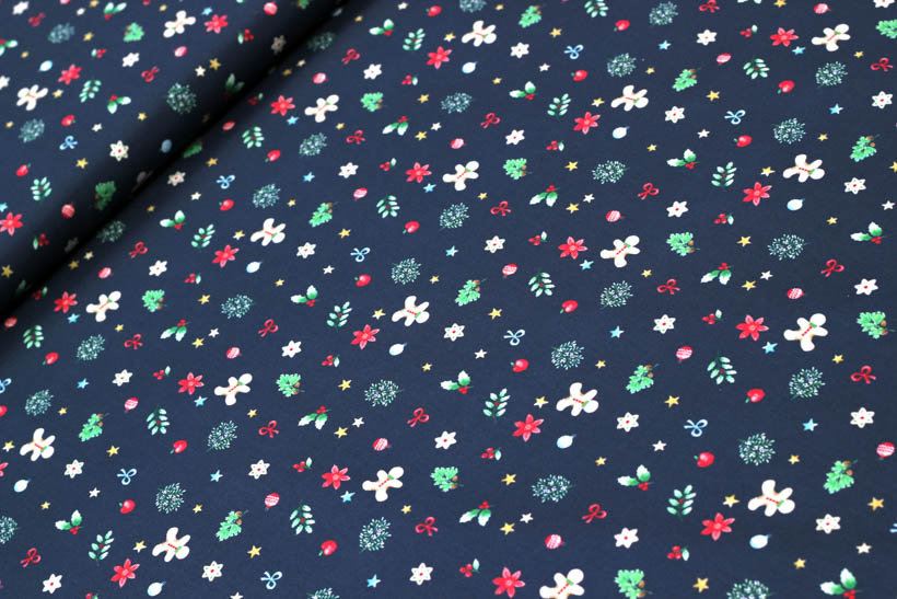 Dekostoff aus Baumwolle mit bunten Weihnachtmotiven auf blauem Hintergrund.