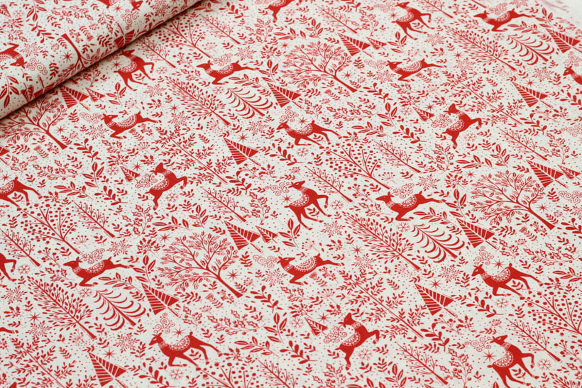 Dekostoff aus Baumwolle mit Weihnachtsmotiven in rot auf weißem Hintergrund von Hilco.