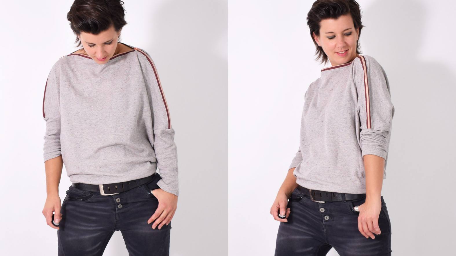 Mit diesem Set kannst Du Dir einen richtig coolen Pullover nähen, mit dem Du sicher eine Menge Komplimente ernten wirst. Der AUFREISSER Pulli lässt sich recht einfach nähen. Der Ausschnitt ist mit einem Reißverschluss versehen, der bis zur Schulternaht reicht und aus dem Pullover ein sehr flottes und trendiges Oberteil zaubert. Durch überschnittene Schultern bekommt er zusätzlich eine lässige und coole Note verpasst.