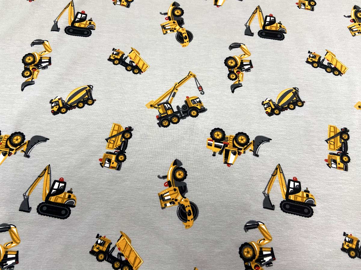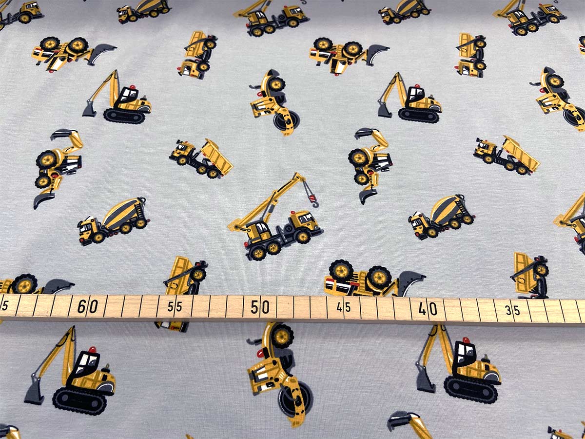Baumwolljersey mit gelben Baustellenfahrzeugen auf grauem Hintergrund.