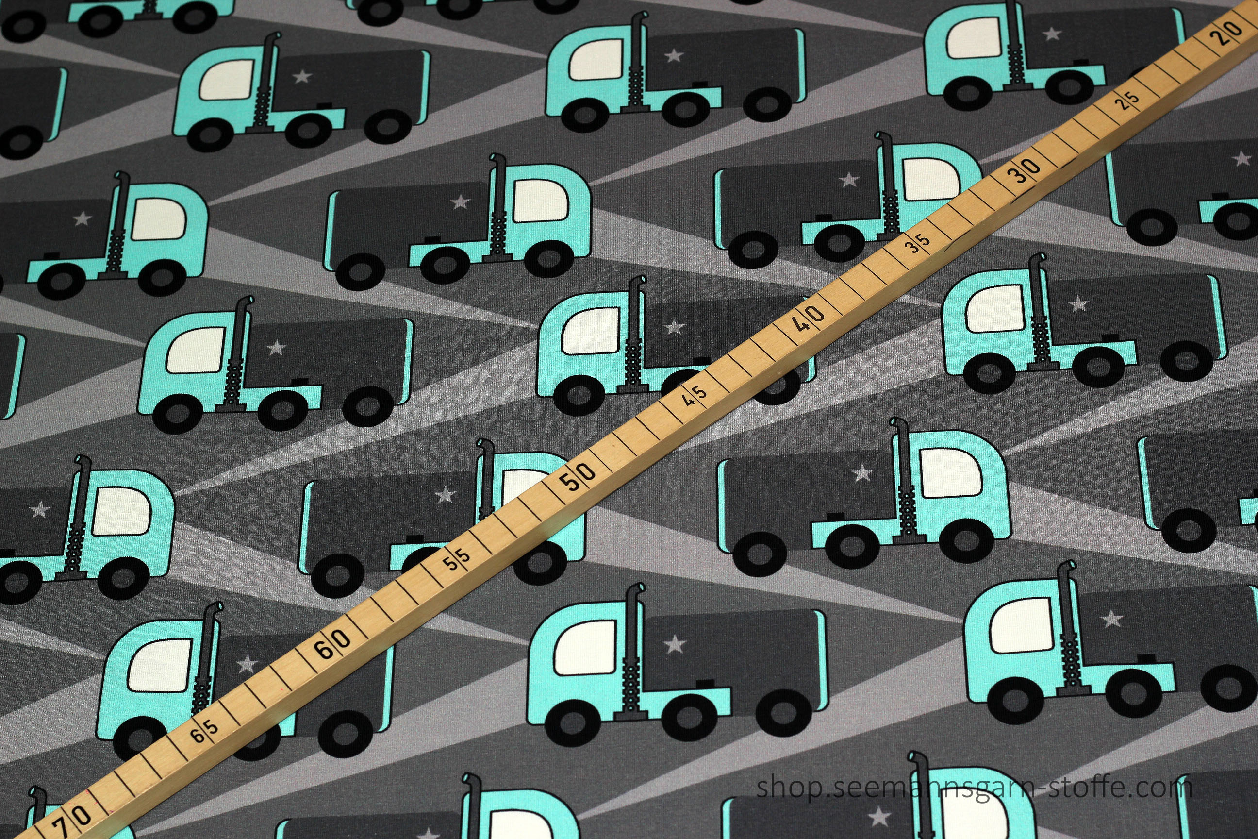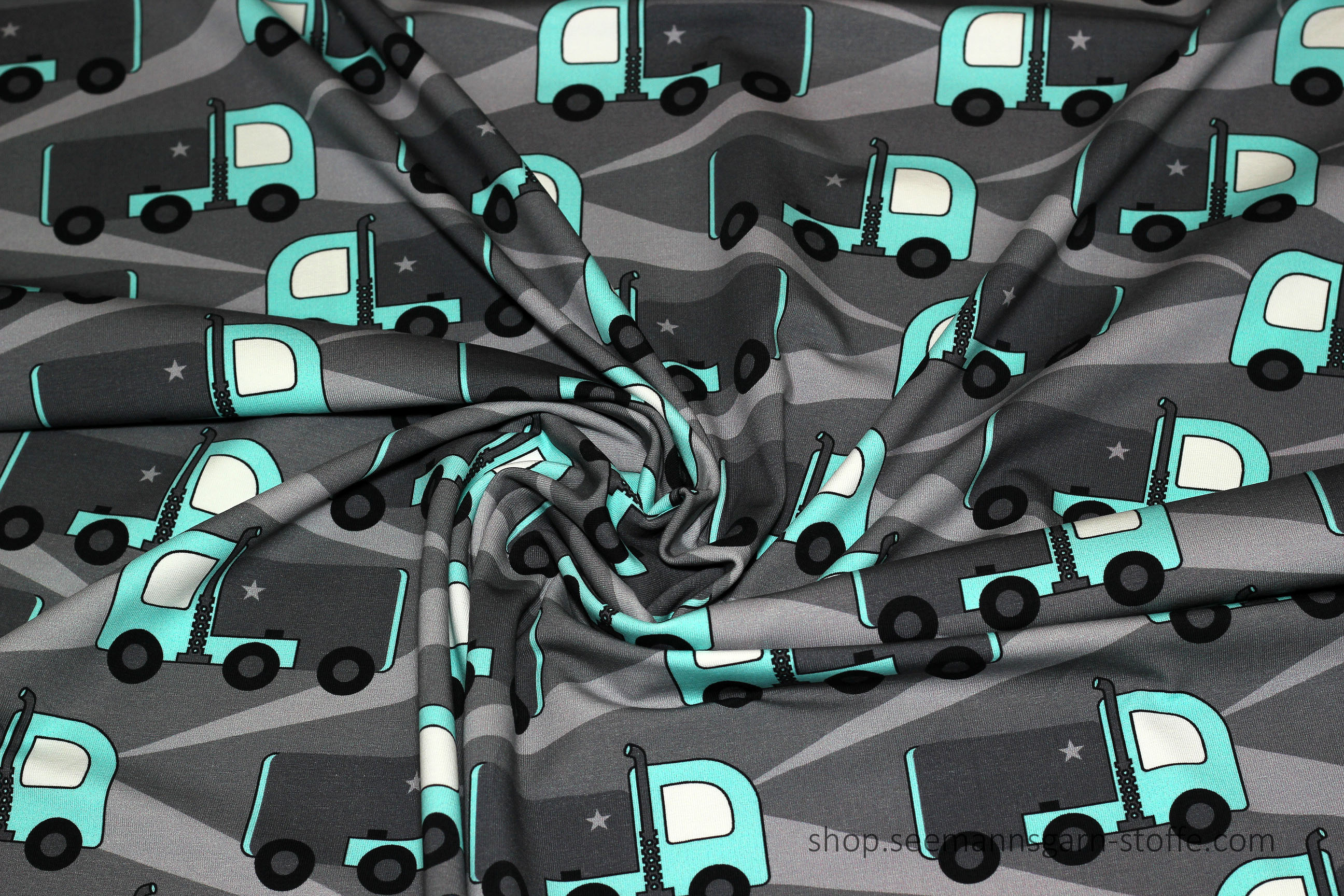 Cooler Jersey von Hilco aus der Kollektion Monster Trucks in dunkelgrau mit türkisen Lastwagen.