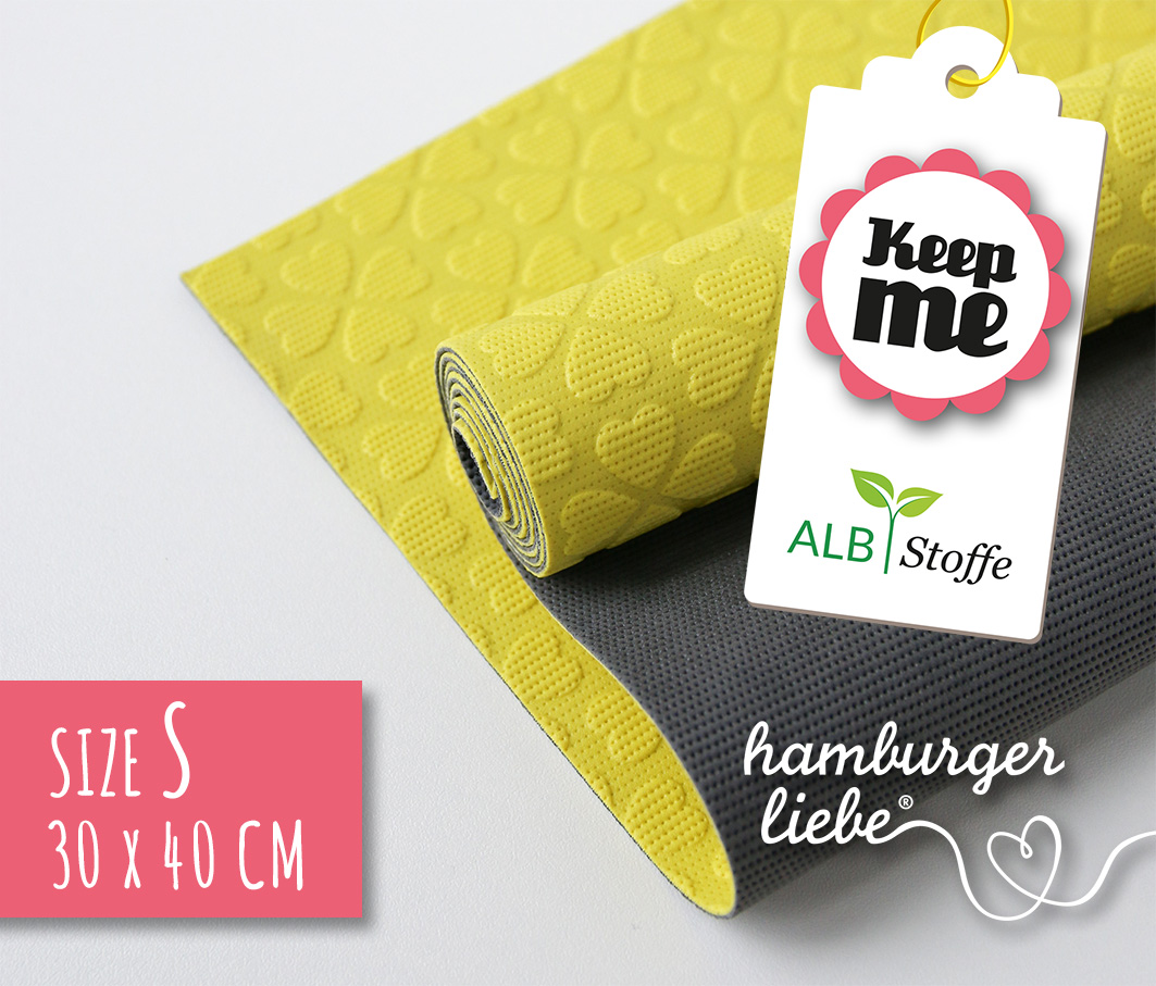 Die waschbare, stylische, vernähbare, beidseitig verwendbare und perfekt zuschneidbare Antirutsch-Matte aus Naturkautschuk im Design von Hamburger Liebe von Albstoffe. Größe S 30x40 cm in gelb.