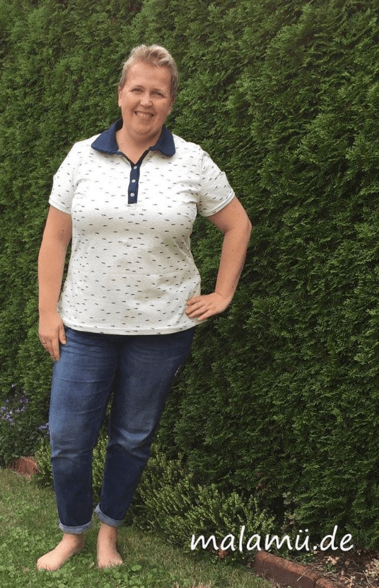 MAliska ist ein figurnah geschnittenes Polo-Shirt. Das Polo wird ganz klassisch mit Steg und Kragen genäht. Zusammen mit dem Fake-Lagenlook und Armpatches kommt es sehr modern und sportlich daher. Natürlich lassen sich die Ärmel auch ohne Fake-Lagenlook nähen. Es gibt verschiedene Kragen-Formen und Ärmel.