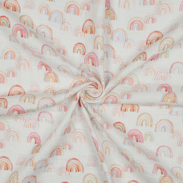 Farbenfroh & Federleicht: Musselin „Regenbogen“ in Weiß – Dein Stoff für gute Laune
