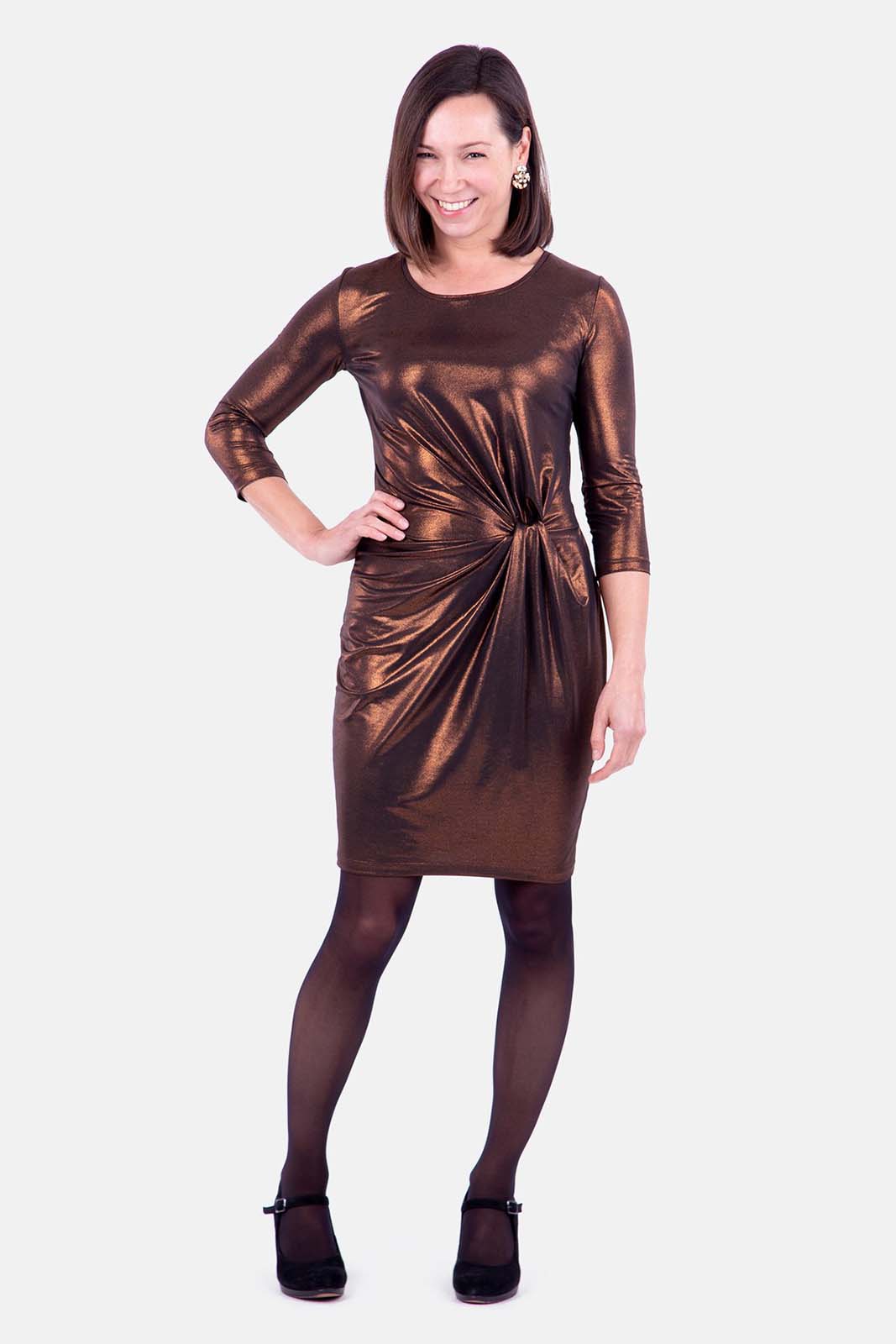 Näh Dir mit dem Papierschnittmuster “Amelie” ein elegantes Jerseykleid mit extravagantem Knoten-Detail, mit dem Du alle Blicke auf Dich ziehen wirst. Das einfache Kleid ist mit dem hübschen Detail ein echtes Must-Have, dabei ist die spezielle Faltenlegung gar nicht kompliziert. Damit das Kleid auch wirklich zu jedem Anlass passt, kannst Du die unterschiedlichen Ausschnitt- und Ärmelvarianten miteinander kombinieren. So kannst Du Dir mit langen Ärmeln ein festliches Kleid für den Winter oder mit kurzen Ärmeln einen Hingucker für die Sommerparty zaubern.