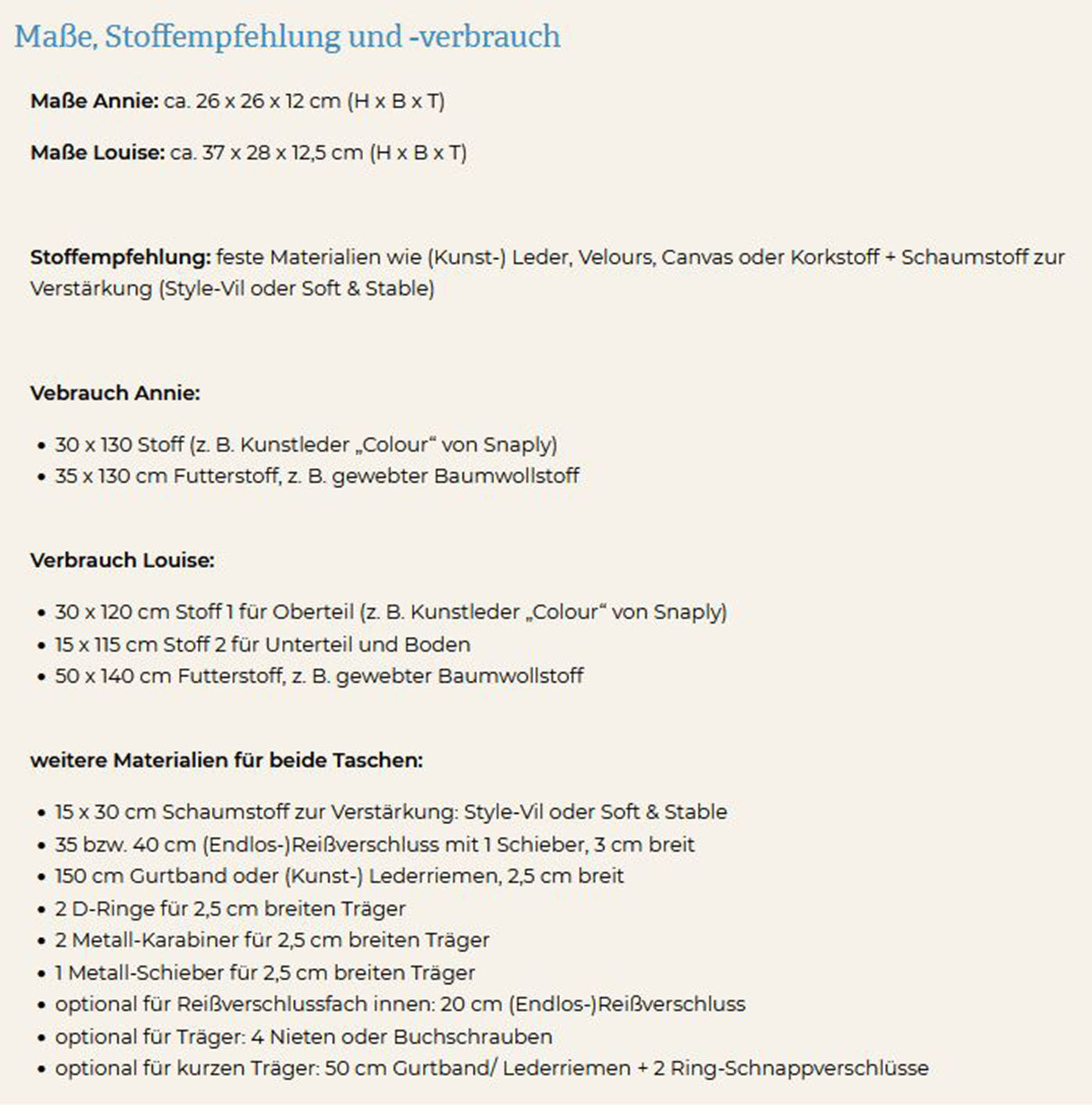 Mit dem Kombi-Papierschnittmuster “Annie & Louise” hast du gleich zwei zeitlose Taschen parat. Die kleine Umhängetasche “Annie” begleitet dich mit ihrer handlichen Größe auf Ausflügen, während die große Version, der Shopper “Louise”, auch im Alltag und Beruf ein praktischer Begleiter ist. Beide Taschen haben einen nach innen versetzten Reißverschluss und sehen besonders edel aus Kunstleder aus. Eine zurückhaltende Optik mit abgesteppten Nähten, die hochwertige Verarbeitung sowie ein raffiniert gesteppter Taschenboden sind weitere, schöne Details.
