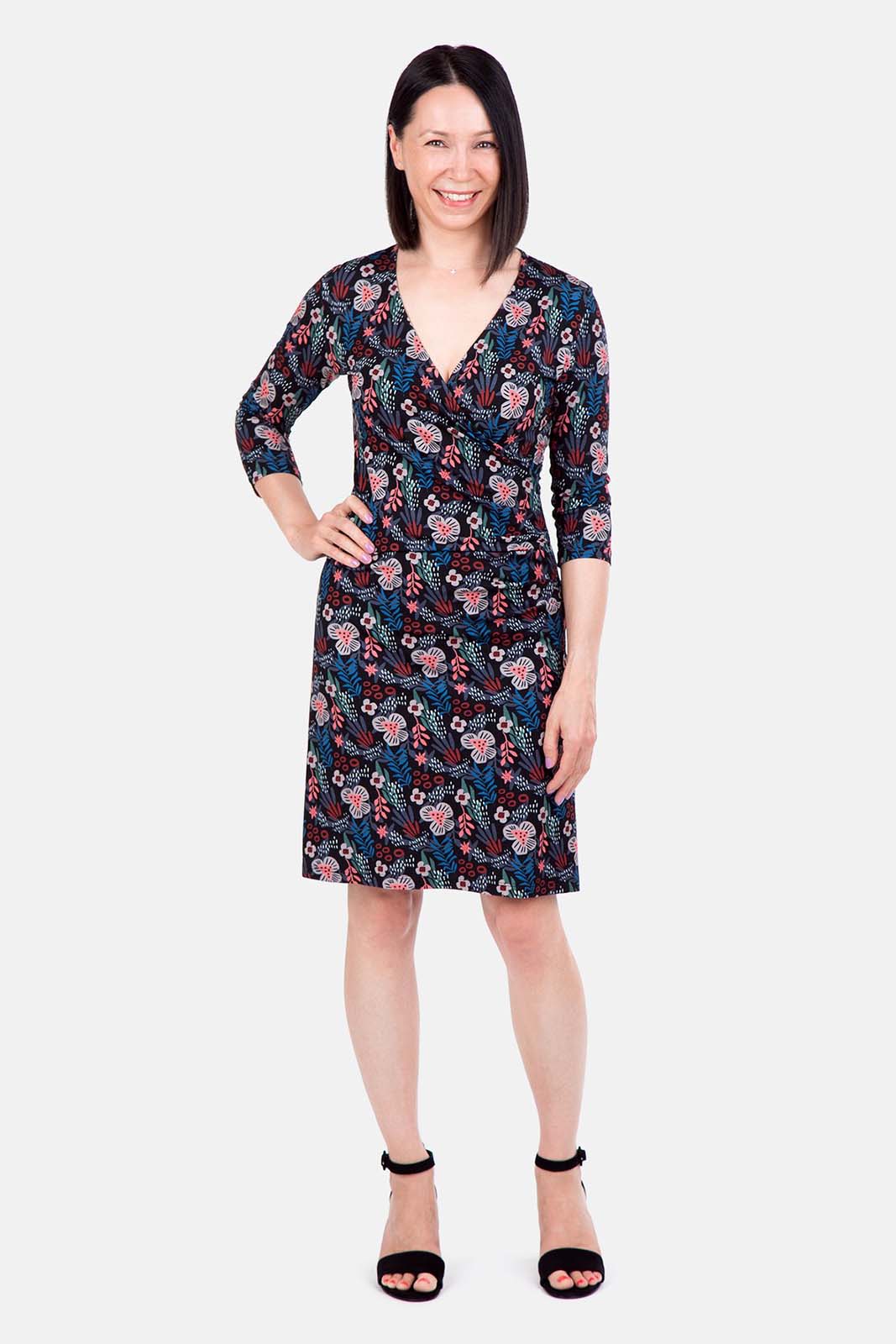 Mit dem Papierschnittmuster “Violet" kannst du bezaubernde Jerseykleider in Wickeloptik nähen. Das Vorderteil wird mit einer Raffung genäht oder in Falten gelegt. Mit dieser effektvollen, seitlichen Drappierung lässt sich dein Bauch- und Hüftbereich ganz wunderbar umschmeicheln. Der Ausschnitt im Wickel-Look wird unauffällig mit einem Stoffstreifen auf die feine Art verarbeitet. Das Kleid ist zum Saum hin leicht ausgestellt und endet kurz über den Knien. Mit den vier verschiedenen Ärmellängen bist du zu jeder Jahreszeit passend für alle möglichen Anlässe gekleidet.
