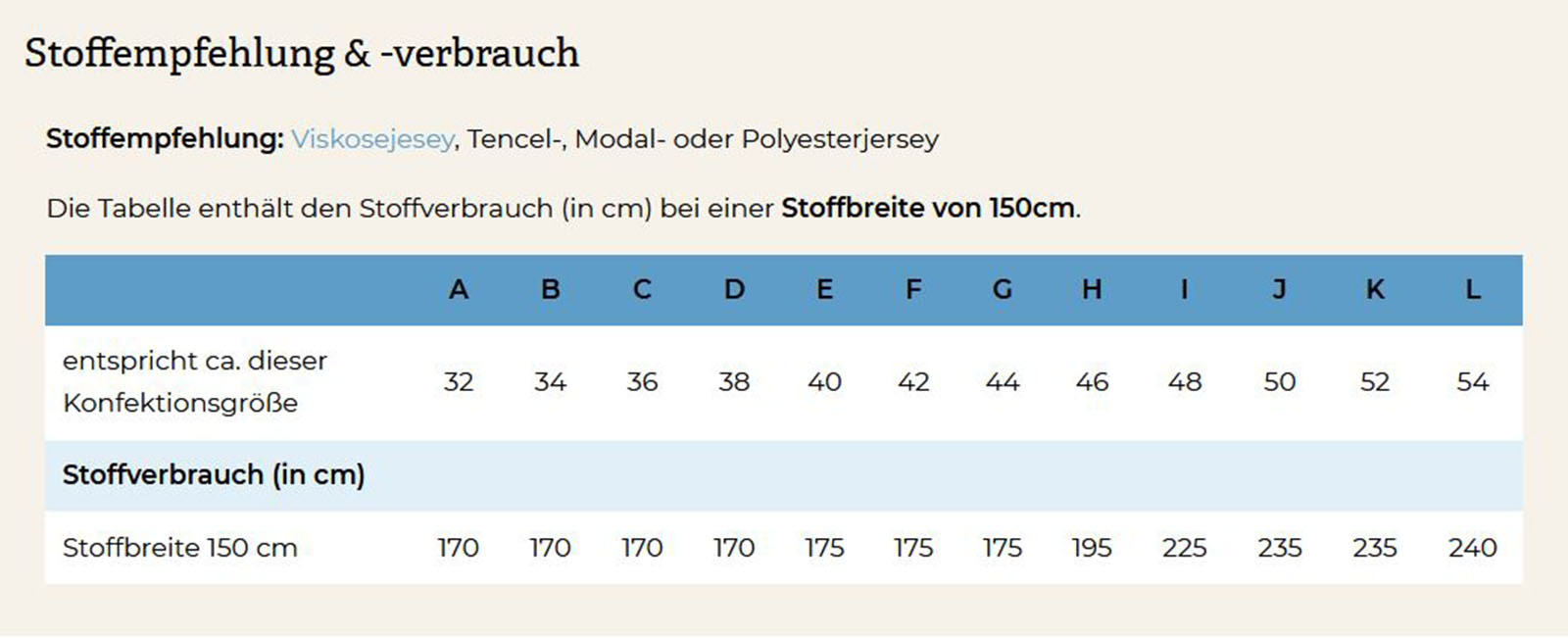 - Handliches Booklet mit Maßtabellen, Zuschnittplänen, Tipps zum Nähen und Anleitung für seitliche Falten und Raffung